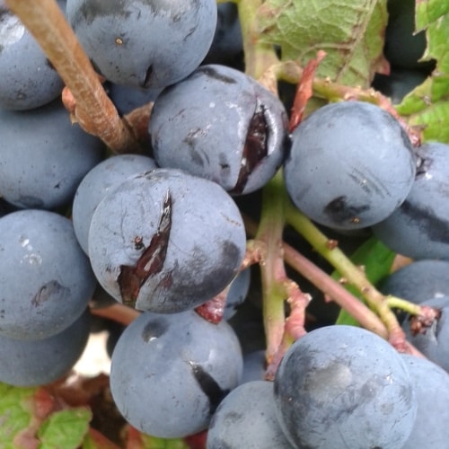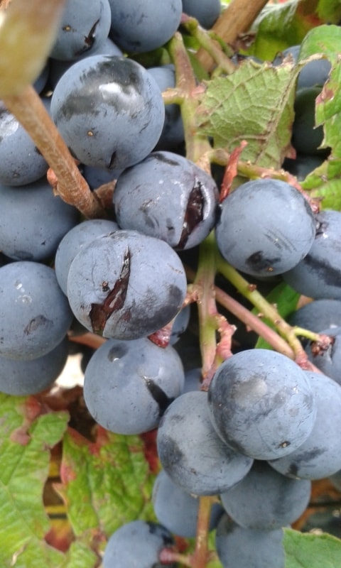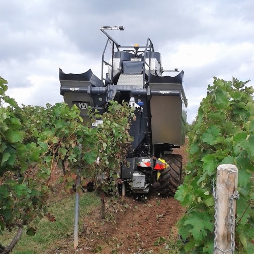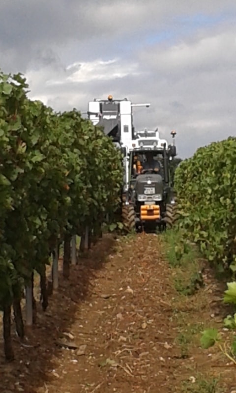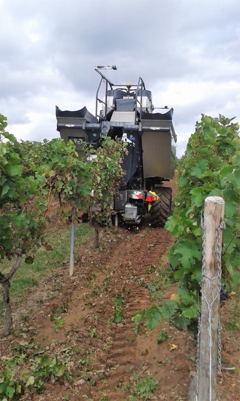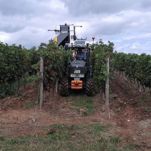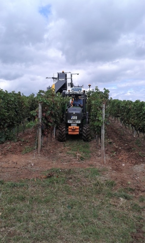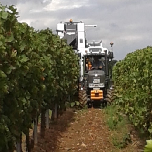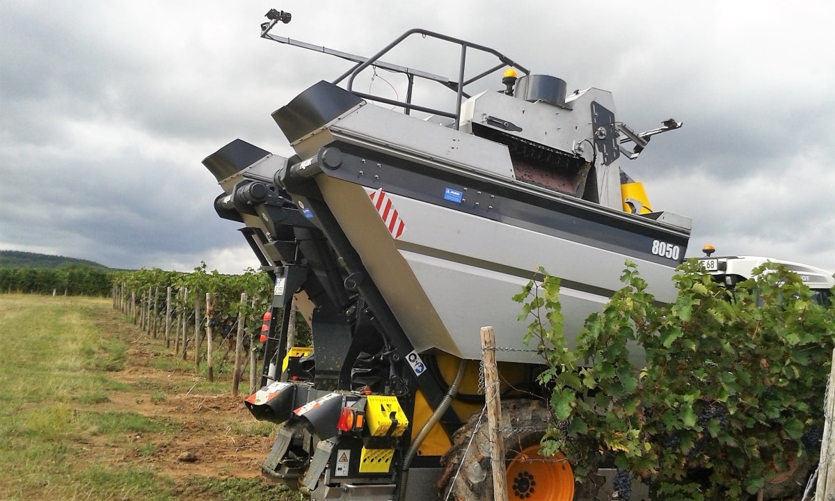 Eigentlich wollten wir unsere Trauben noch ein paar Tage von der Sonne verwöhnen lassen, aber ein kräftiges Gewitter mit Hagel fordert von uns Winzern eine direkte Reaktion. Die Beeren, die von den Hagelkörnern getroffen wurden, sind sofort aufgeplatzt, und deswegen ein willkommenes Futter für Wespen, Fliegen, Ameisen und Co. Diese kleinen Tierchen können dem Lesegut so großen Schaden zufügen, dass es zu Fehlgeschmäcken beim Wein kommen kann. Zum Glück gibt es Erntemaschinen, die dem Winzer ein schnelles, kurzfristiges Handeln ermöglichen um die Trauben abzuernten, wodurch schlimmeres verhindert werden kann.